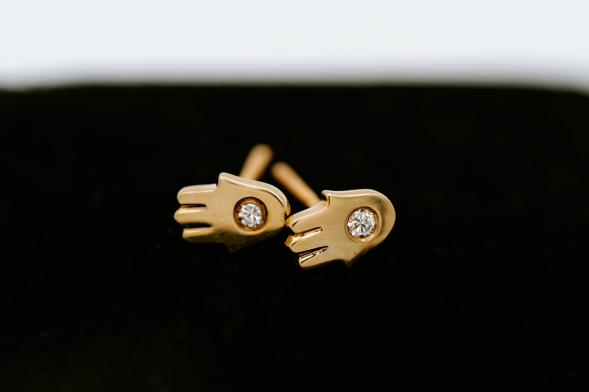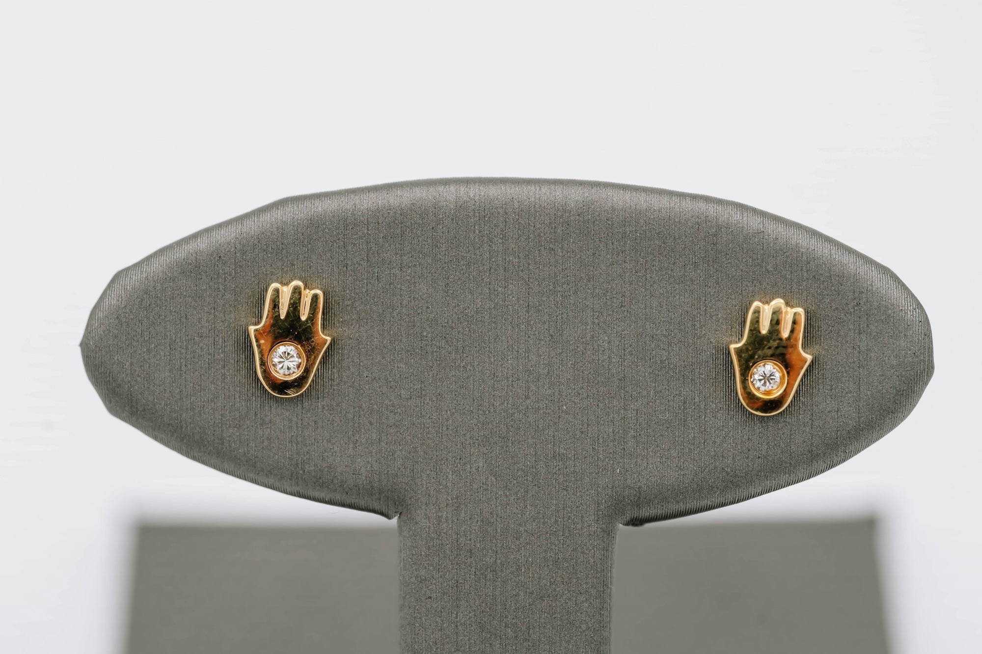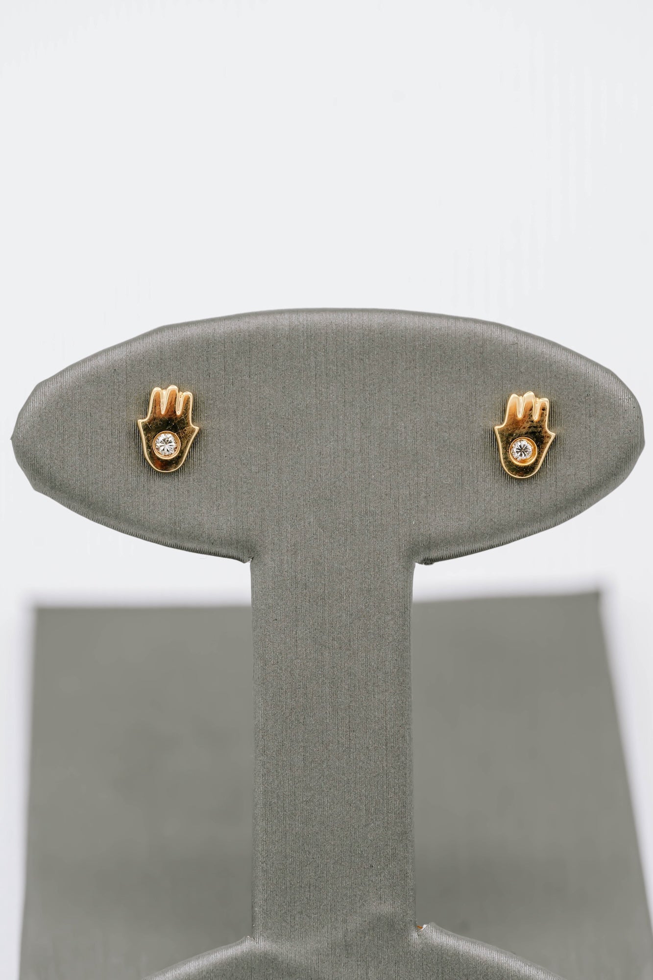 14K hamsa earrings with natural, round, centre, diamond. These earrings come with screw-on backings.