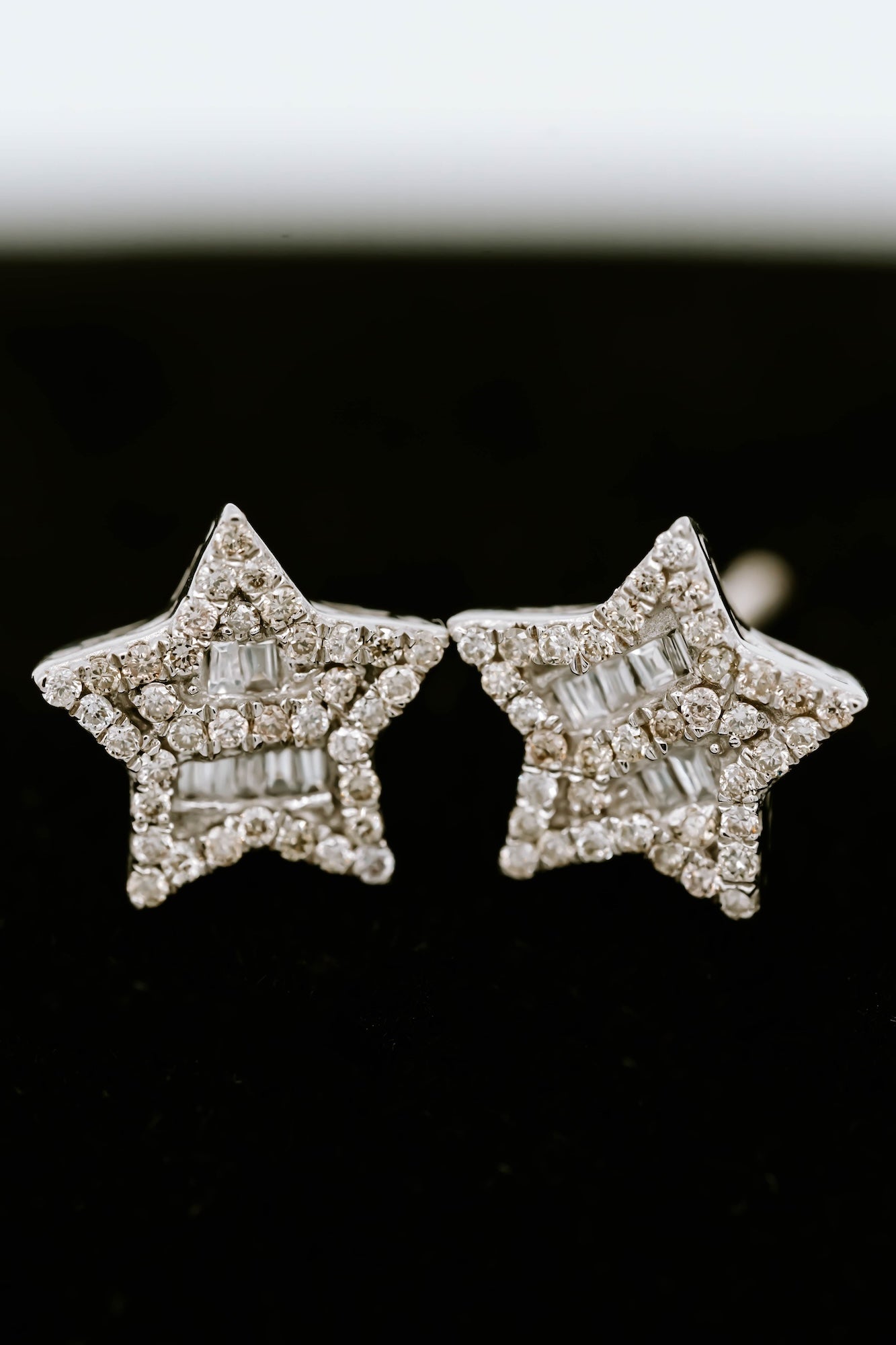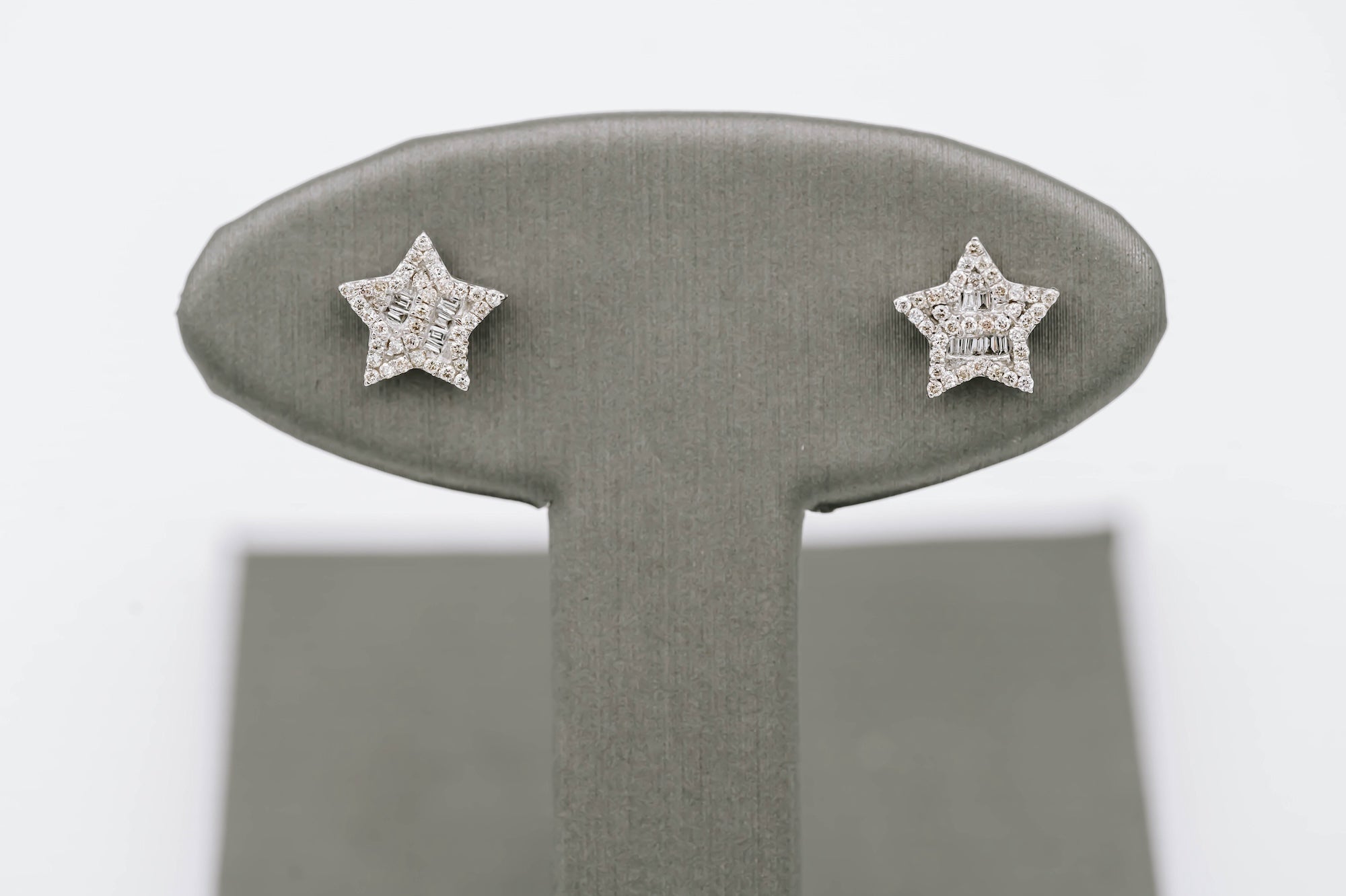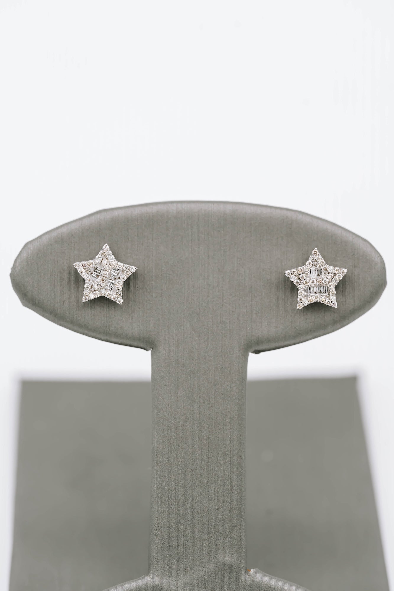 White gold star earrings with natural round and baguette diamonds. These earrings come with screw-on backings.