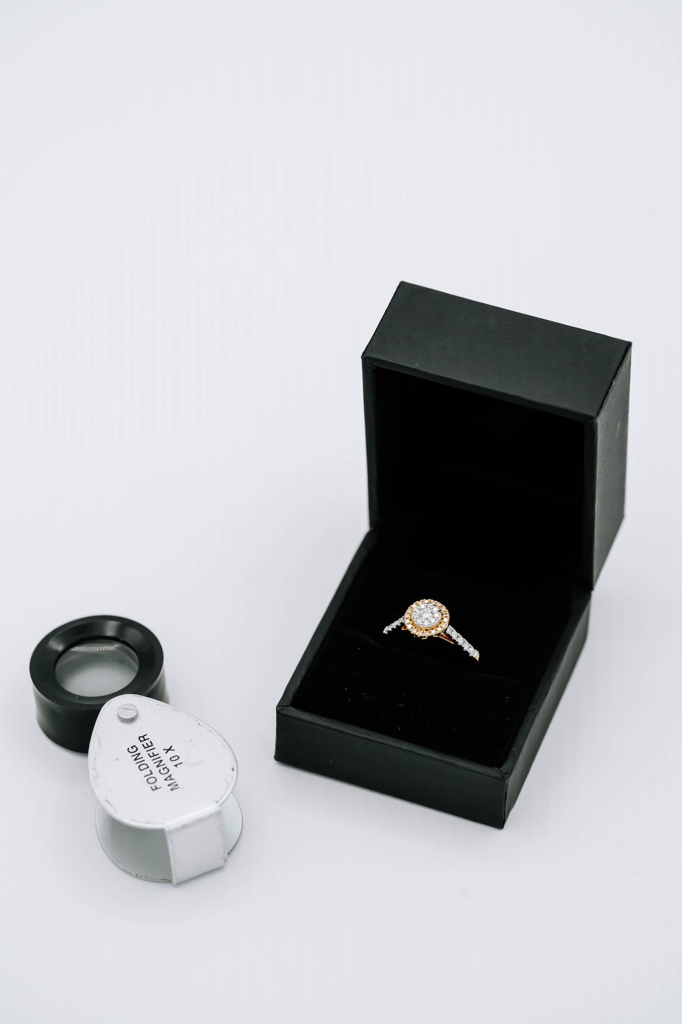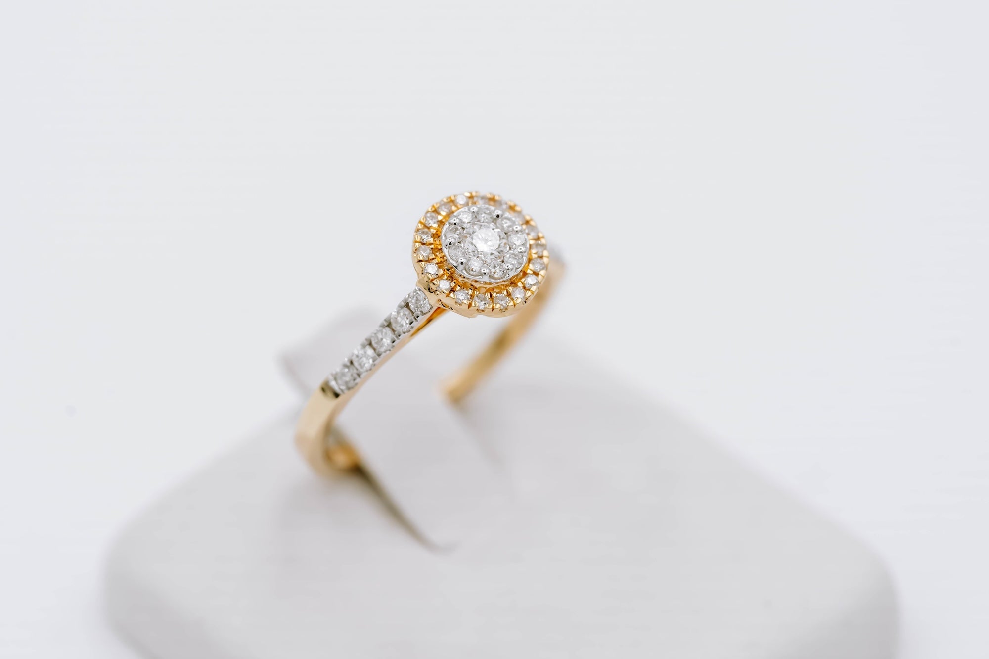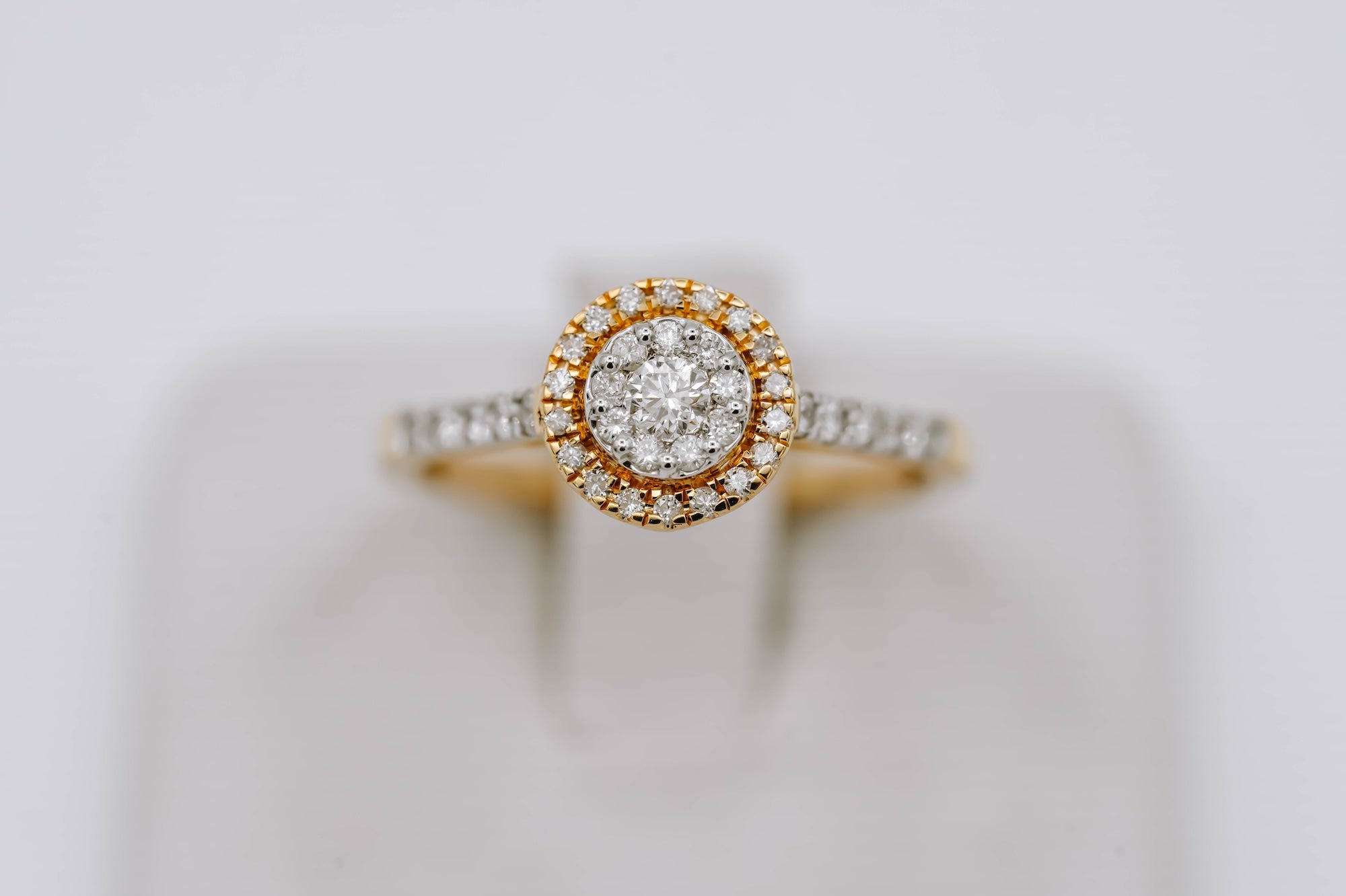 Ladies' round ring with halo. Featuring natural diamonds in a cluster setting.