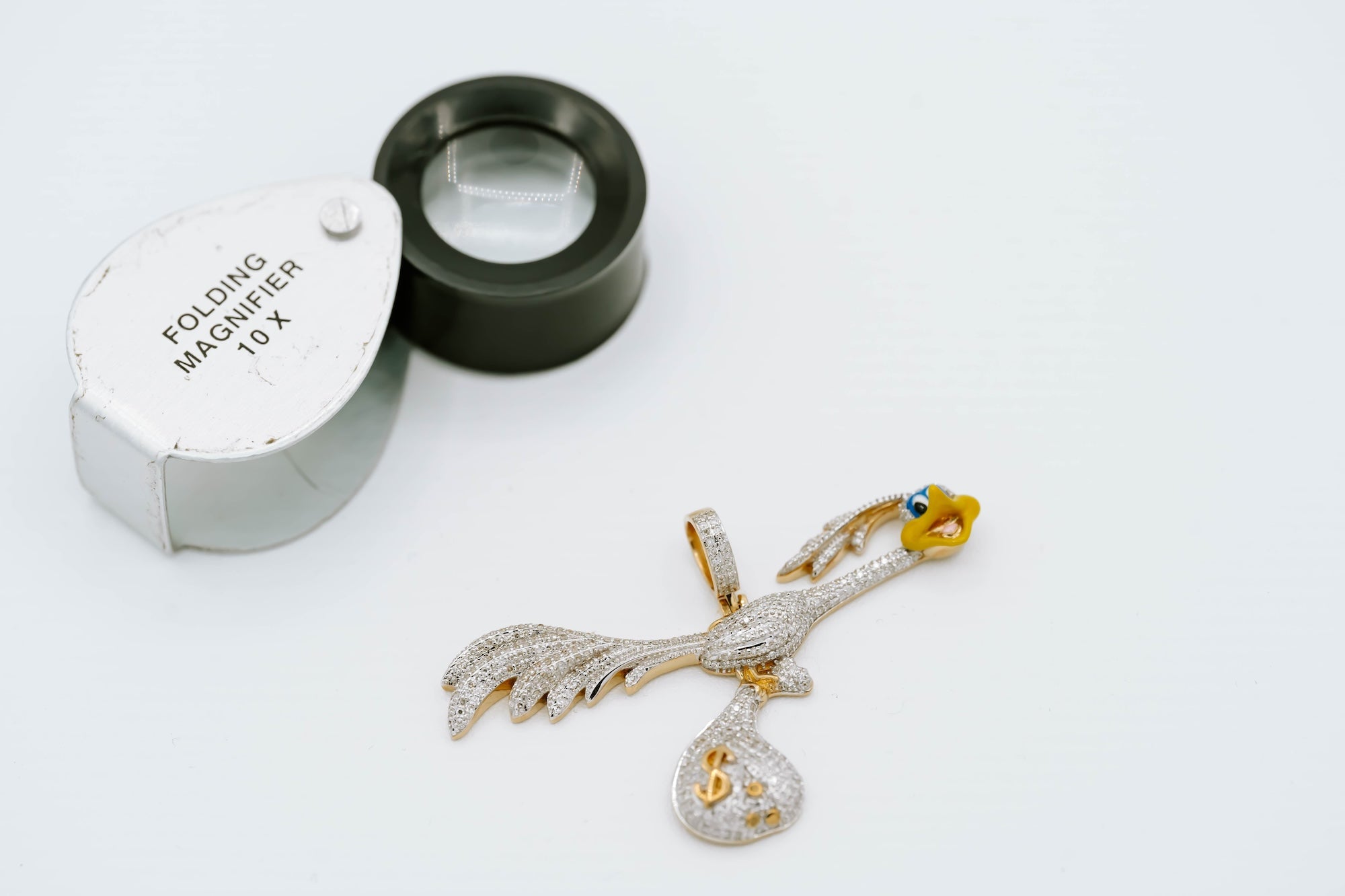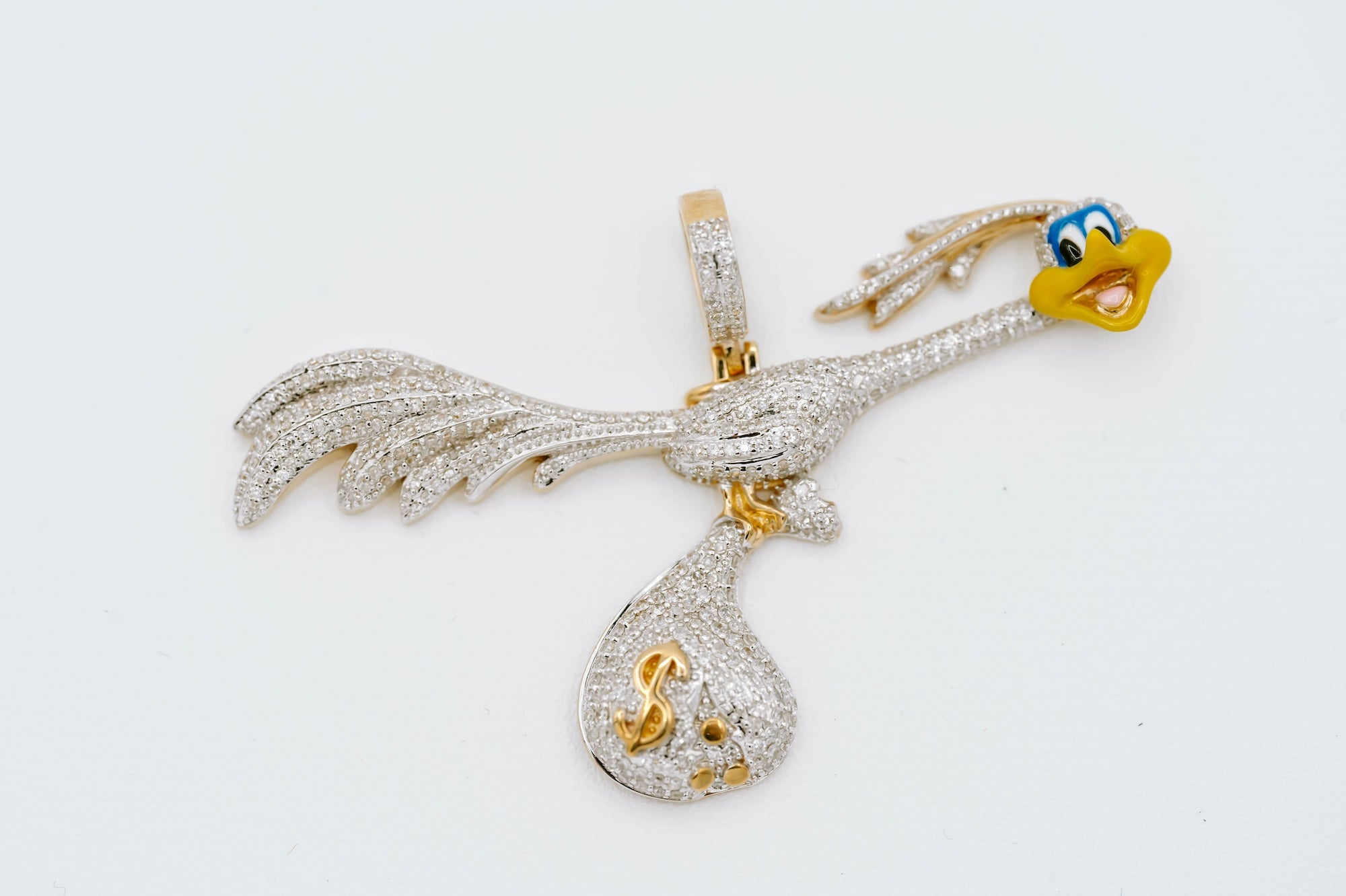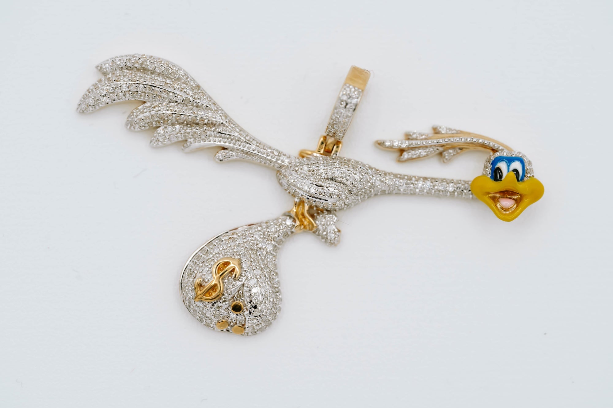 Cartoon pendant with money bag. Bright enamel and natural diamonds capture amazing detail in this piece.