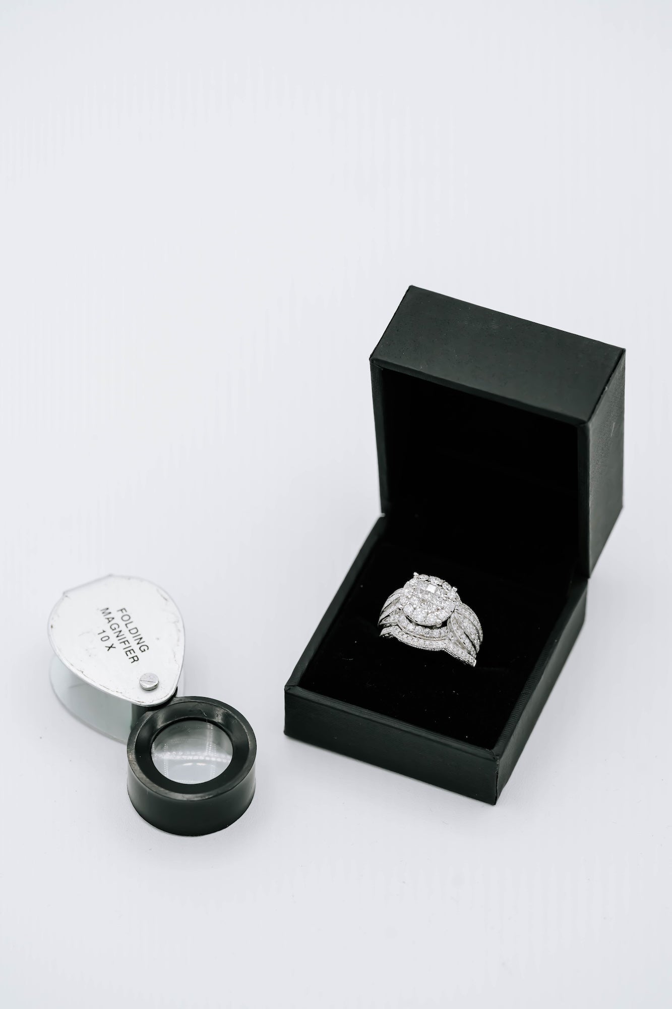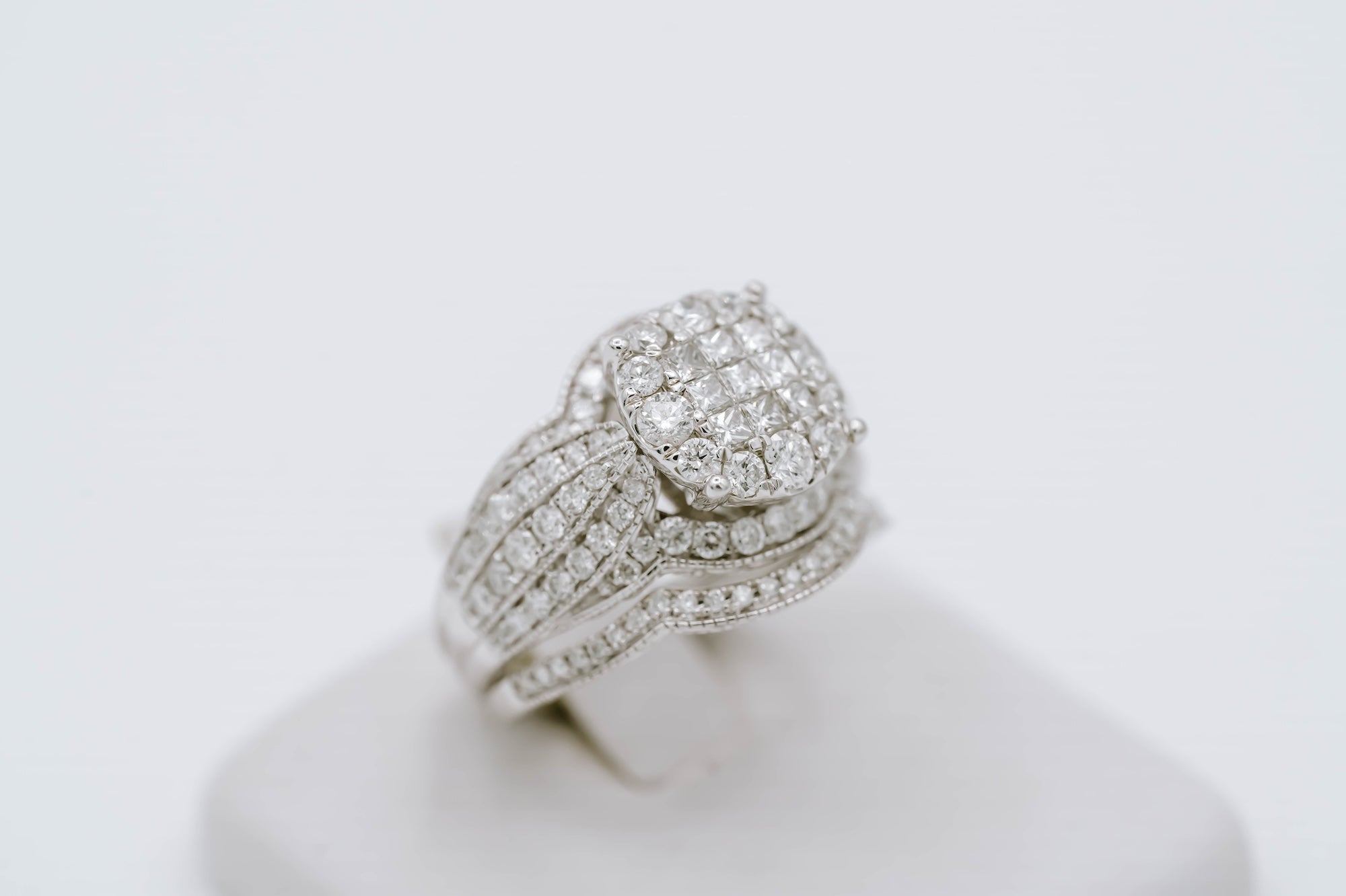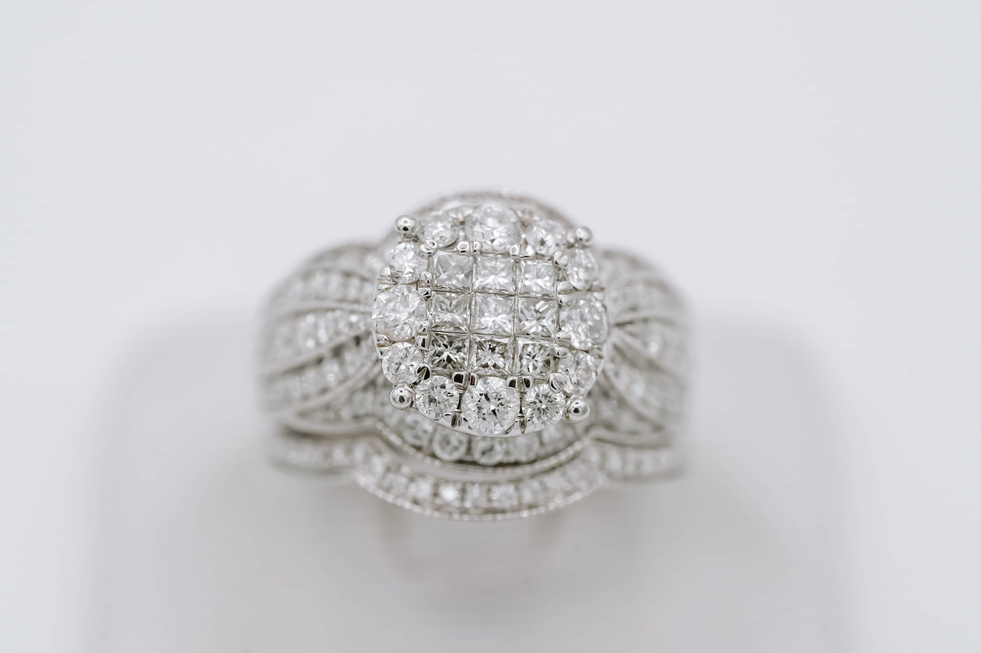 Ladies' bridal set (ring and band) with natural round and princess-cut diamonds.